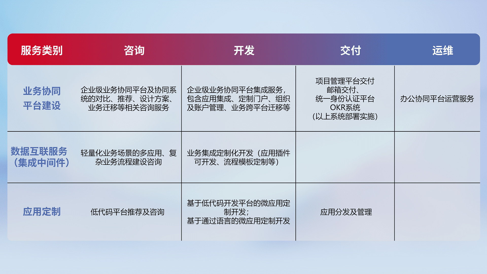 针对钉钉、、企微、、、IDaas等平台级产品提供产品的规划、、、方案、、、交付、、、定制化开发等服务,,,,实现如统一协同办公、、、、智能客户服务、、、混合会议管理、、、、智能数据查询、、等业务场景,,,,实现数字化转型。。